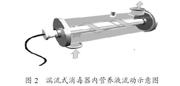 針對(duì)上述問(wèn)題,自行設(shè)計(jì)了一種新型的紫外線消毒器[17]:在消毒腔體內(nèi)安裝螺旋形導(dǎo)流片,使?fàn)I養(yǎng)液以湍流形式流動(dòng)(圖2),即讓沿不銹鋼腔體內(nèi)壁流動(dòng)的營(yíng)養(yǎng)液也有一部分時(shí)間是在石英套管附近流動(dòng)。營(yíng)養(yǎng)液在距離紫外燈管較近或較遠(yuǎn)的兩個(gè)區(qū)域停留的時(shí)間接近,從而解決了因一部分營(yíng)養(yǎng)液滅菌不徹底而影響整體滅菌效果的問(wèn)題。