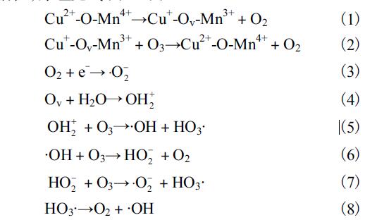 Cu 摻雜會增加比表面積,改變化學(xué)鍵,并促進多價金屬的轉(zhuǎn)化和氧空位的產(chǎn)生[12].加入Ce 后,催化劑中的小半徑的Cu-Mn 取代了CeO2 中的大半徑的Ce,進入到CeO2晶格中,從而產(chǎn)生很多的表面空位,形成缺陷結(jié)構(gòu),加快了供氧速度,從而提高了催化劑活性,促進對O3的轉(zhuǎn)化率[13–14].Mn 與Cu 的氧化物復(fù)配會產(chǎn)生錳銅固溶體,從而導(dǎo)致晶格氧的缺陷,有效地改善了催化劑吸附和活化氧的能力,并且通過兩者的復(fù)配形成的銅錳尖晶石將進一步提高催化劑的活性,原理見式(1)—(8).