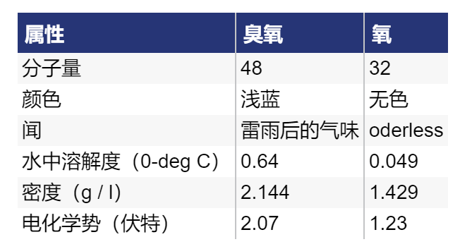 臭氧是水和空氣應用中 很強大的氧化劑之一。請參閱下面的臭氧的不同屬性: