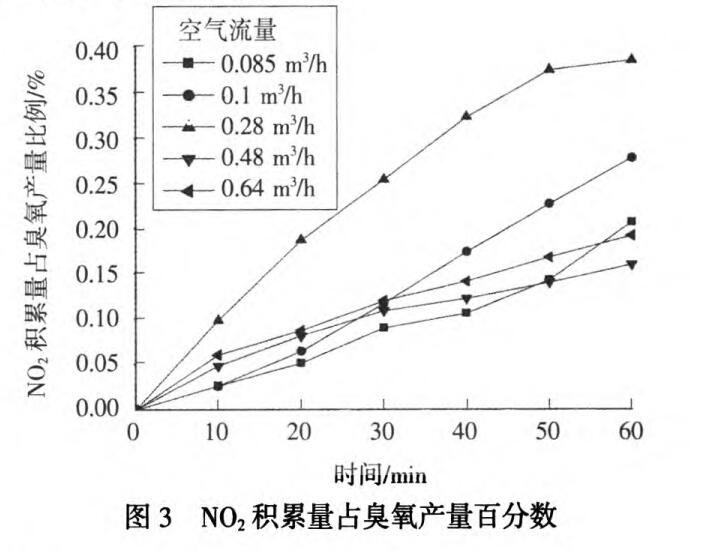 調節空氣進氣流量為0.10 m3/h、O.28 m3/h、048 m3/h、O.64 m3/h,在不同流量下測定NO2產量(見圖1)。該臭氧發生器在每個空氣流量下,NO2產量都隨時間的增加而增大,并且隨著空氣流量的增大,NO2產量先增大后減小,空氣流量為0.28 m3/h時,其時產量很大;空氣流量為0.64 m3/h時NO2產量又高于空氣流量0.48m3/h時NO2的產量。