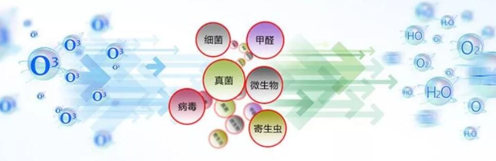 臭氧(O3)的消毒原理是:臭氧在常溫、常壓下分子結構不穩定,很快自行分解成氧氣(O2)和單個氧原子(O)。后者具有很強的活性,對細菌有極強的氧化作用,將其殺死,多余的氧原子則會自行重新結合成為普通氧原子(O2),不存在任何有毒殘留物,故稱“綠色”消毒劑。它不但對各種細菌(包括肝炎病毒,大腸桿菌,綠濃桿菌及雜菌等)有極強的殺滅能力,而且對殺滅霉菌也很有效。