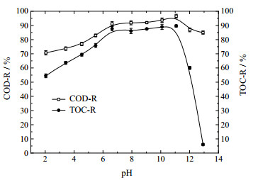 從圖可以看出,其它條件不變,當進料pH在2.00~6.63時,COD和TOC去除率隨著pH的增大而快速增高,此階段為臭氧直接氧化占主導地位,主要發生初始快速反應[18-19];當進料pH在6.63~11.00時,COD和TOC去除率均達到較高水平并隨著pH的增大而提高,在進料pH為11.00時分別達到 很高去除率96.56%和89.63%,此階段為自由基間接氧化占主導地位,不僅發生初始快速反應,更進行了深度慢速氧化反應[19-20];當進料pH高于11.00時,隨著進料pH的增大,COD和TOC去除率均迅速下降,這是由于少部分苯酚被深度氧化為CO2在強堿性體系中轉化為CO32-及HCO3-離子,抑制了苯酚的氧化過程[19]。由此說明, 很佳為進料pH為11.00。